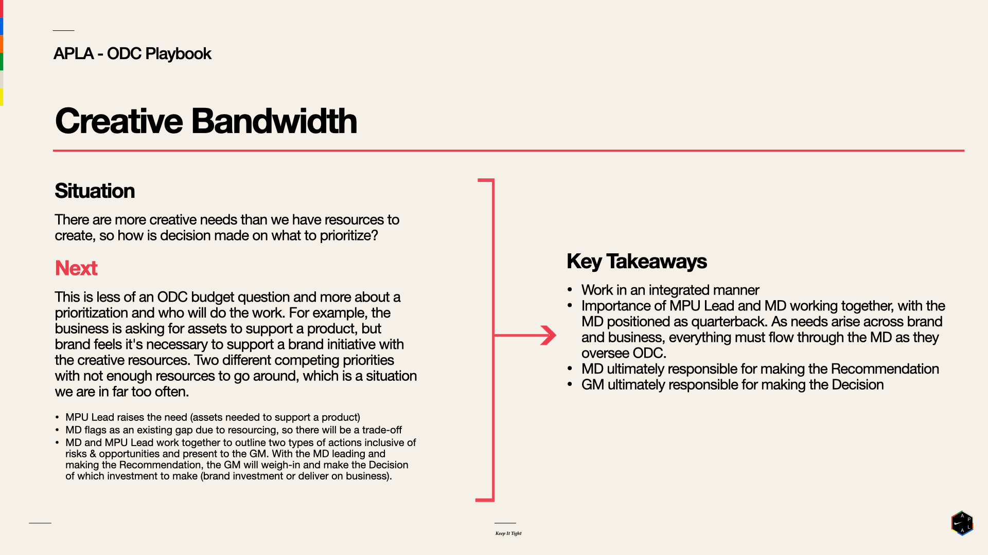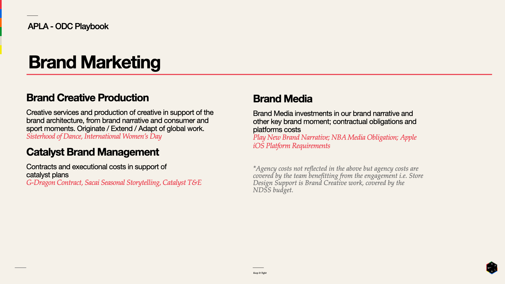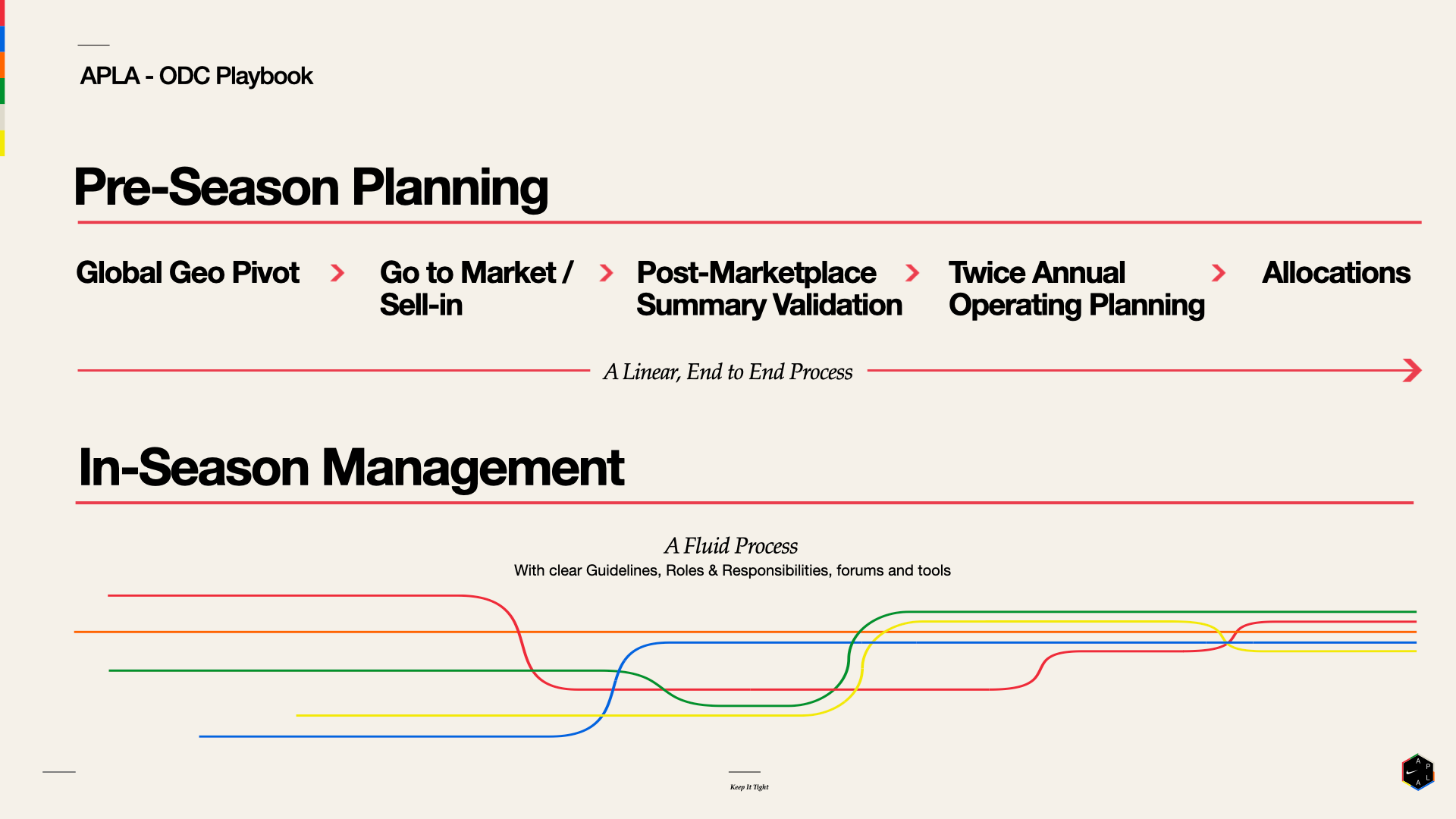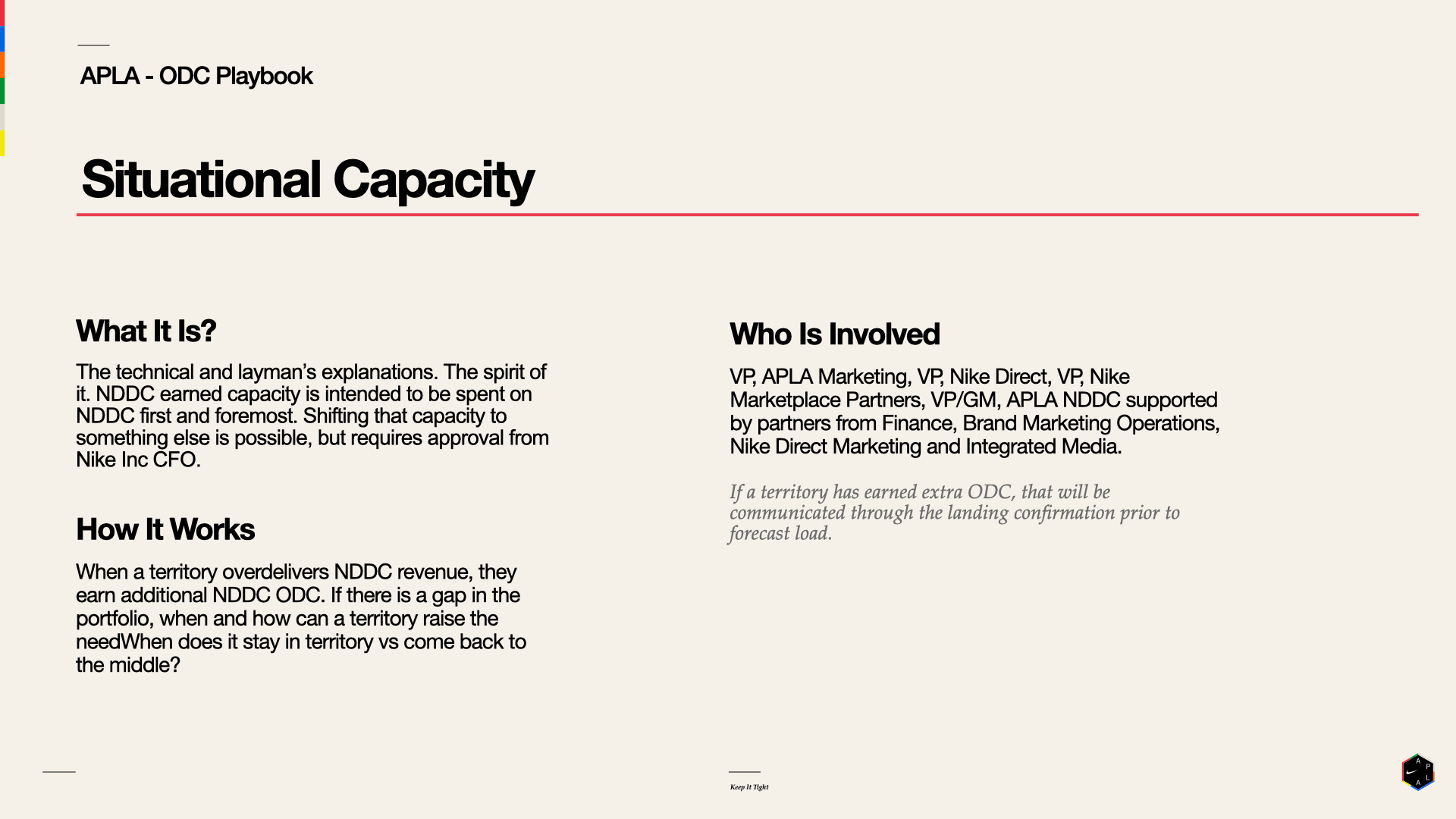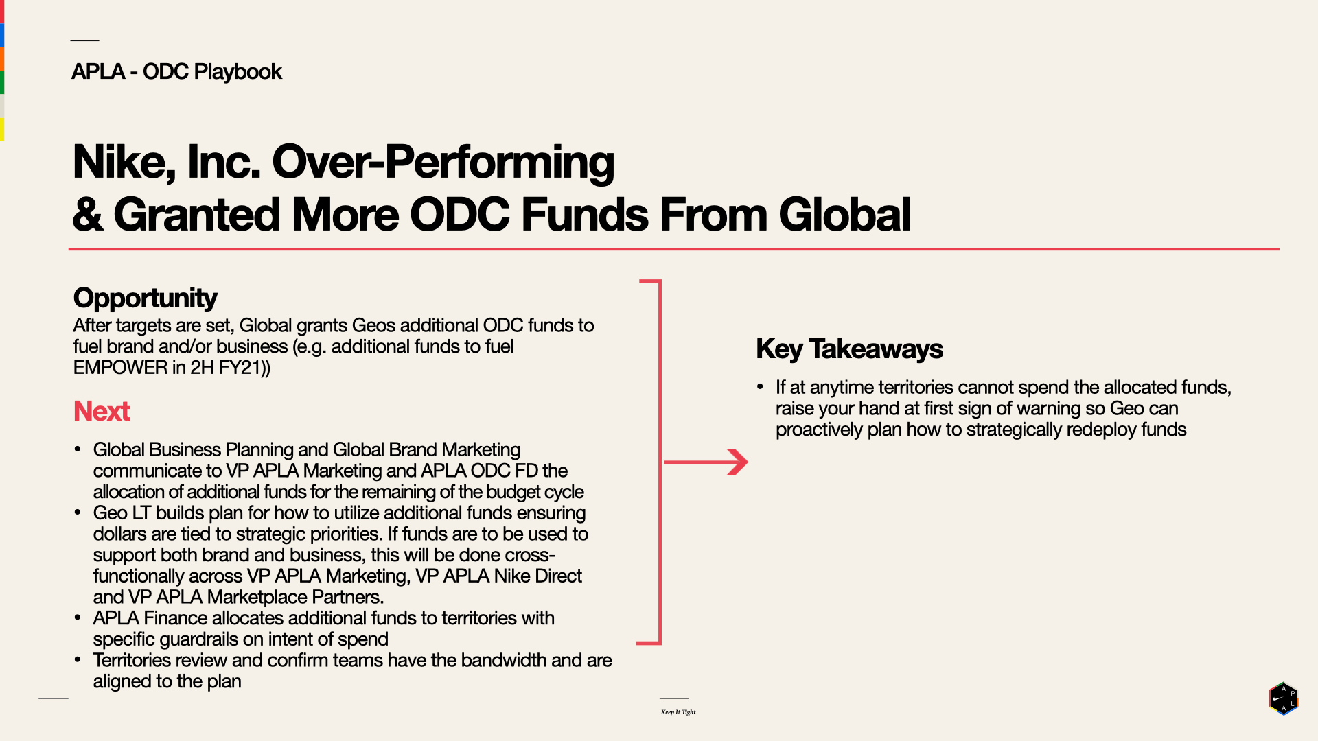 I was tasked with marrying five decks from five different groups into one cohesive “plan of attack” everyone could rally around. It took a lot of hand-holding edits, but my project manager and I built an excellent rhythm, and—through experience—we learned how to tailor our communication style for each Nike program manager. I also had to lobby hard for what content truly mattered, pushing to cut redundancy while protecting the insights that moved decisions forward. Once we aligned on the narrative, I mapped the information architecture and designed visuals that translated complex concepts into language—and graphics—that laypeople could grasp at a glance. The result was a single, clear deck that accelerated cross-team alignment and made next steps obvious.